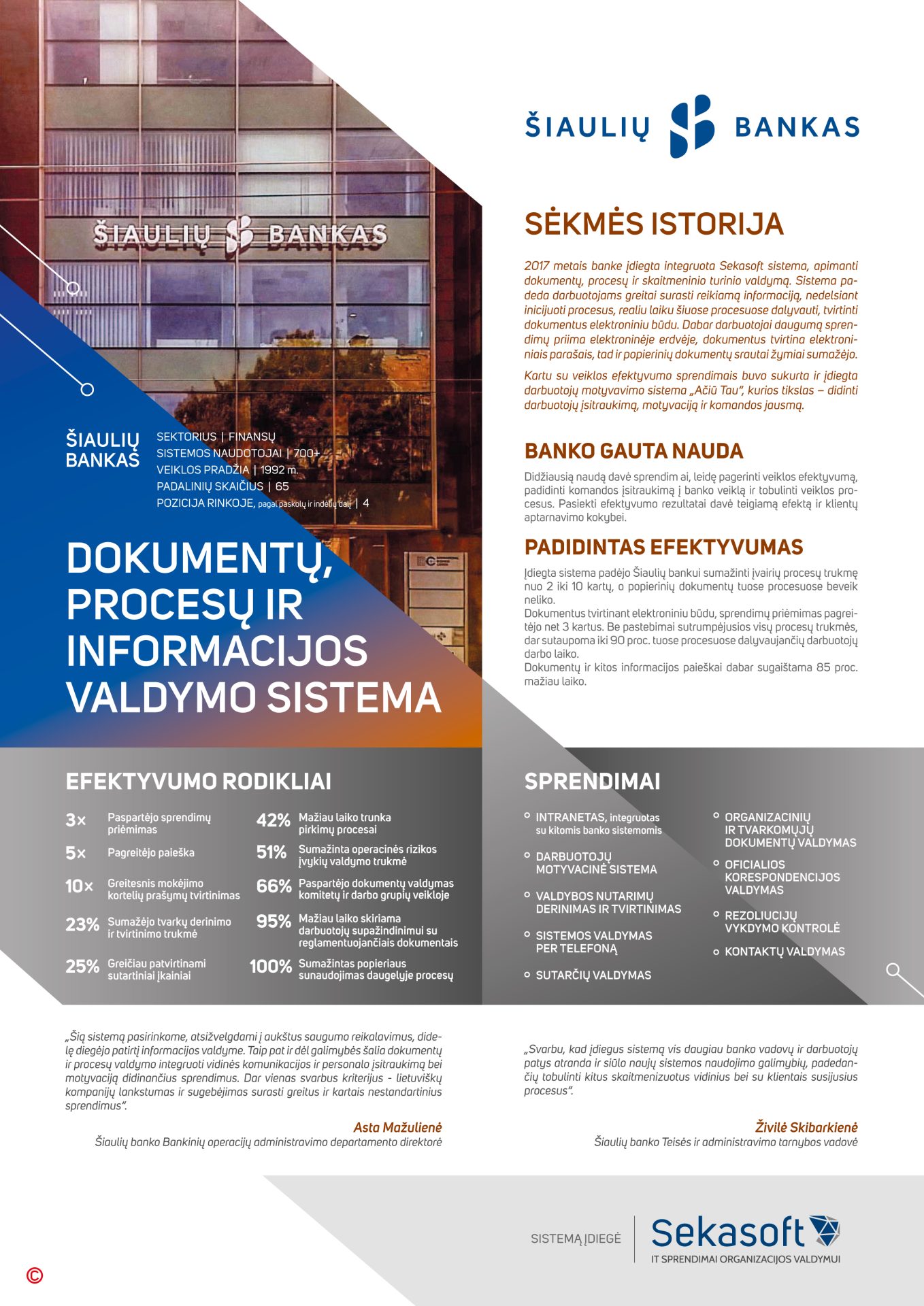 2017 metų bėgyje baigtas dokumentų ir procesų valdymo sistemos diegimas Šiaulių banke. Sistema banke naudojasi daugiau nei 700 darbuotojų, o įdiegti sprendimai net 5 kartus pagreitino dokumentų paiešką, 3 kartus – sprendimų priėmimą, o tokį procesą, kaip klientų mokėjimo kortelių prašymų tvirtinimas, pagreitino net iki 10 kartų!